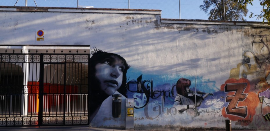 The next stop is Colegio Santo Domingo, the walls are full of graffiti, but actually the real work by El Niño are the paintings of an old man playing violin, the American jazz trumpeter (Louis Armstrong) and a girl’s face.