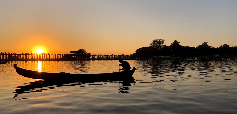 參觀完兩個佛塔就趕忙開到烏本橋 (U Bin Bridge) 等日落,太陽雖然還高掛著,但已經有許多人在小船上卡位等待了。司機幫我們安排了一個小船,我們就在船上拍照等日落,烏本橋據說是由1千多個柚木所建成,連結了湖岸兩邊的交通,這樣傳統的建法,走在沒有欄杆的橋上還真是讓人有點緊張。